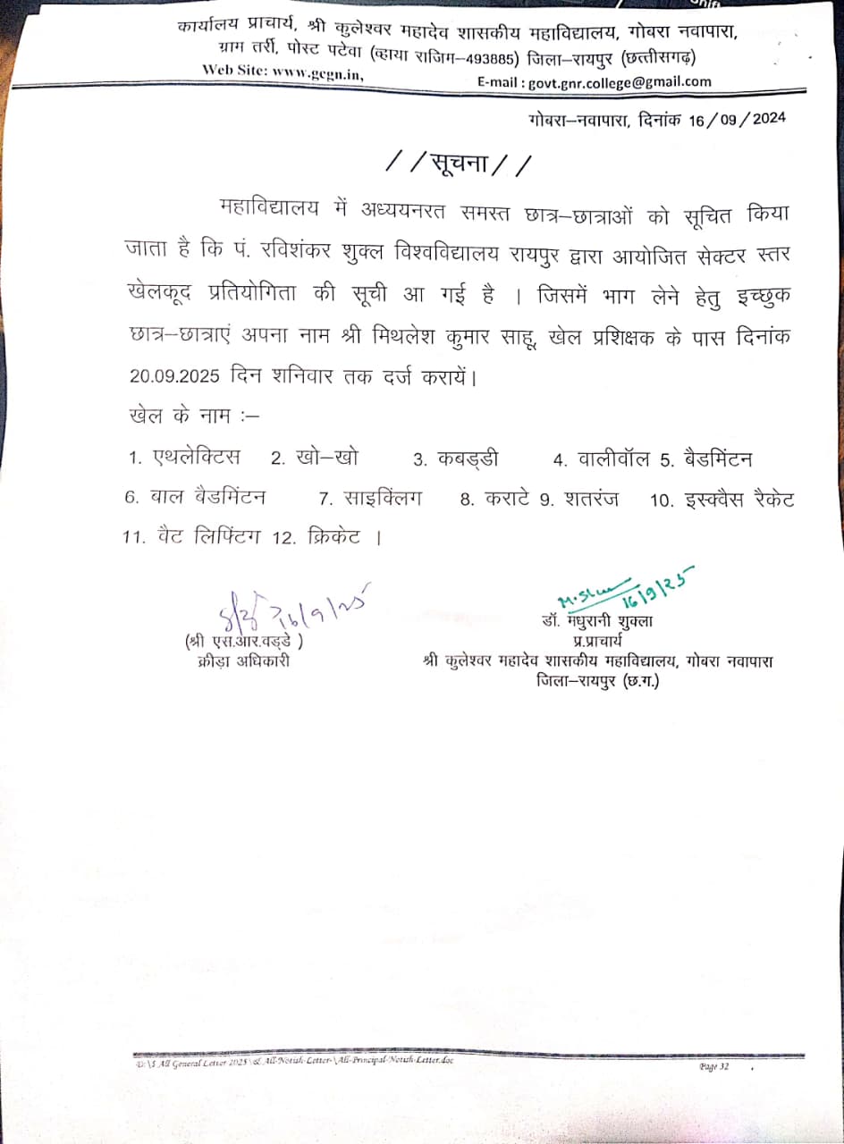 Here stands the revered temple of Lord Kuleshwar Mahadev and Lord Vishnu as Shri Rajiv Lochan. This divine presence of both Hari and Har Makes the town widely known as a part of Sacred Harihar Kshetra. Nestled in this spiritually rich landscape, the town of Nawapara Rajim located on the Raipur -Gariaband Road, is approximately 45 kilometres from Raipur. This tranquil yet vibrant setting offers students a serene learning environment infused with heritage and natural beauty. Situated in Tarri Village, the college campus is approximately 1 kilometre west of Nawapara Town. With a commitment to holistic development, the college not only focuses on academic excellence but also nurtures students through a wide spectrum of cultural, literary, and sporting activities. Through initiatives such as the National Service Scheme (NSS) and various academic and vocational workshops, students are encouraged to develop leadership, civic responsibility, and essential life skills. Presently, the college is home to approximately 1500 students, guided by a dedicated team of qualified and experienced faculty members. The institution strives to instil moral values and a sense of social commitment, fostering the growth of responsible citizens. Affiliated with Pt. Ravishankar Shukla University, Raipur, the college offers a range of undergraduate and postgraduate programs including B.A., B.Sc., B.Com., DCA, P.G.D.C.A., and PG courses in six subjects i.e. Hindi Literature, Geography, Chemistry, Political Science, Economics and Commerce in ensuring access to quality higher education for students from both rural and urban backgrounds. Nestled amidst the serene beauty of nature, the college stands at the confluence of rural ethos and modern aspirations, providing an enriching academic atmosphere. Its vision transcends traditional teaching—it aims to build character, inspire thought, and shape future leaders.