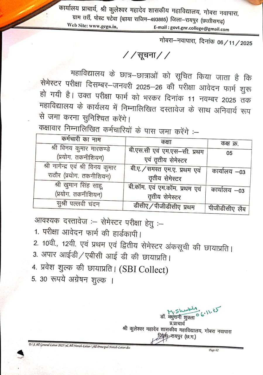 Here stands the revered temple of Lord Kuleshwar Mahadev and Lord Vishnu as Shri Rajiv Lochan. This divine presence of both Hari and Har Makes the town widely known as a part of Sacred Harihar Kshetra. Nestled in this spiritually rich landscape, the town of Nawapara Rajim located on the Raipur -Gariaband Road, is approximately 45 kilometres from Raipur. This tranquil yet vibrant setting offers students a serene learning environment infused with heritage and natural beauty. Situated in Tarri Village, the college campus is approximately 1 kilometre west of Nawapara Town. With a commitment to holistic development, the college not only focuses on academic excellence but also nurtures students through a wide spectrum of cultural, literary, and sporting activities. Through initiatives such as the National Service Scheme (NSS) and various academic and vocational workshops, students are encouraged to develop leadership, civic responsibility, and essential life skills. Presently, the college is home to approximately 1500 students, guided by a dedicated team of qualified and experienced faculty members. The institution strives to instil moral values and a sense of social commitment, fostering the growth of responsible citizens. Affiliated with Pt. Ravishankar Shukla University, Raipur, the college offers a range of undergraduate and postgraduate programs including B.A., B.Sc., B.Com., DCA, P.G.D.C.A., and PG courses in six subjects i.e. Hindi Literature, Geography, Chemistry, Political Science, Economics and Commerce in ensuring access to quality higher education for students from both rural and urban backgrounds. Nestled amidst the serene beauty of nature, the college stands at the confluence of rural ethos and modern aspirations, providing an enriching academic atmosphere. Its vision transcends traditional teaching—it aims to build character, inspire thought, and shape future leaders.